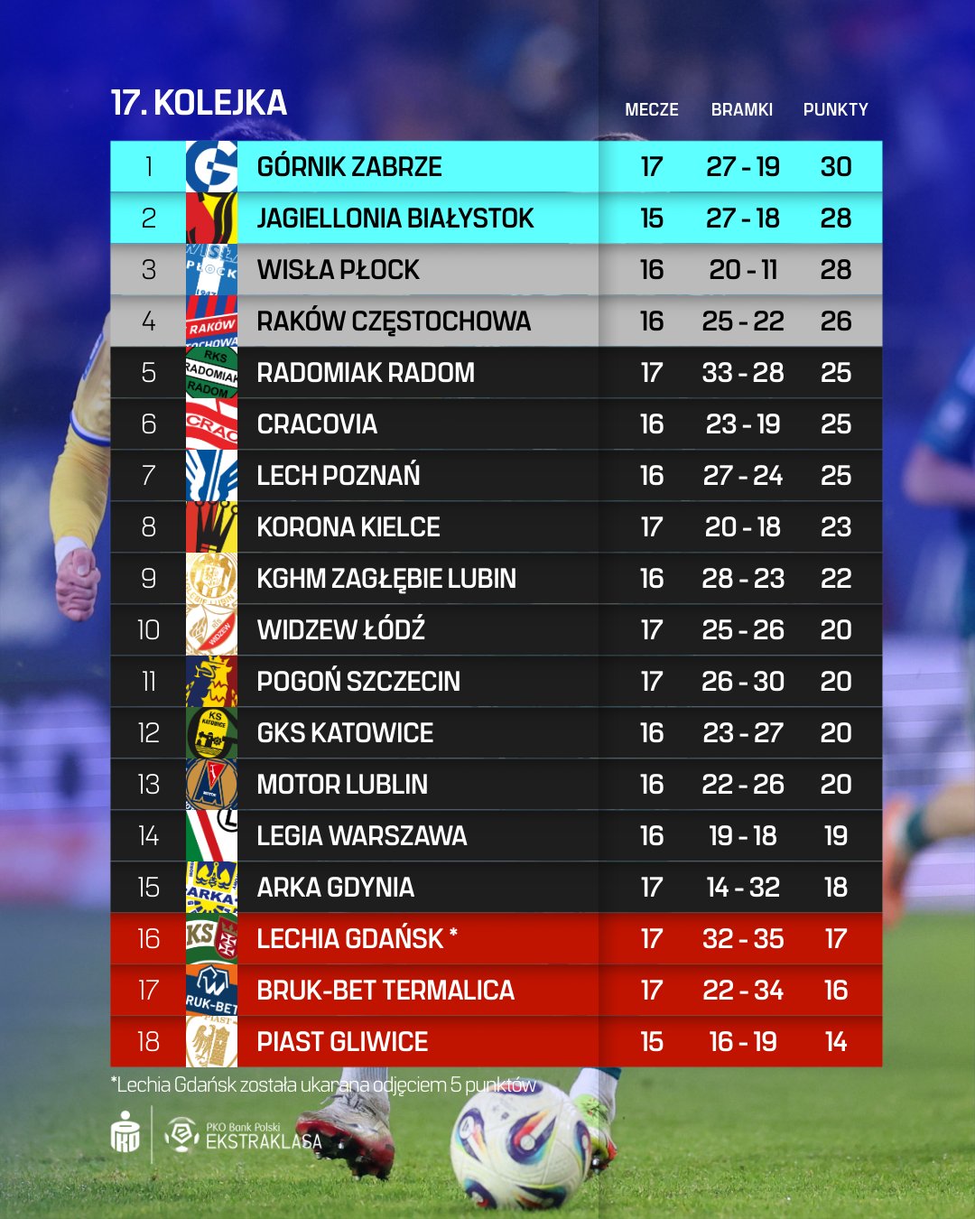 W trzech meczach zwycięzcy strzelali minimum cztery gole. Każdy z nich rozstrzygnął się różnicą przynajmniej trzech bramek. Kolejne dwa starcia triumfatorzy rozstrzygnęli na swoją korzyść dwoma trafieniami i raz - jednym. Tylko dwukrotnie w całej kolejce przegrane zespoły zdołały zdobyć choćby honorowe bramki. Stąd bardzo duża średnia przewaga wygranych ekip. Nie udało się odnieść sukcesu między innymi żadnej z drużyn, tworzących TOP-4 przed startem rywalizacji, przy czym trzy z nich wyszły ze swoich starć z jednym punktem. Wyraźna zadyszka dotknęła Górnik Zabrze. Mimo, że utrzymał się na pozycji lidera, to ma on gorszą średnią punktów (1,76/mecz) od drugiej Jagiellonii Białystok (1,87/mecz), a nieznacznie lepszą od Wisły Płock (1,75/mecz). Nafciarze w czwartek zagrają zaległe starcie z Cracovią. Jeśli go wygrają, wskoczą na pozycję lidera. Według symulacji Opta Stats Perform nadal największą szansę na końcowy triumf ma Jaga, choć prawdopodobieństwo spadło z 46% do 44%. Jeszcze mocniej regres widać u Górnika Zabrze - z 20% do 11%. Najmocniej podniosła się natomiast prognoza u Rakowa Częstochowa - z 13% do 23%. Medaliki wygrały po raz piąty w siedmiu ostatnich starciach i zameldowały się na 4. miejscu, choć przed startem tego okresu były jedenaście lokat niżej.