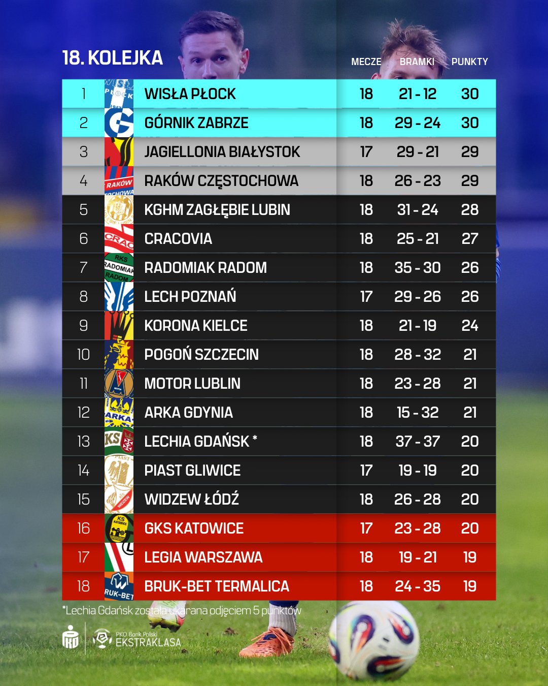 Nic nie zmieniło się po tych trzech zaległych spotkaniach na samym szczycie tabeli. Pozycję lidera utrzymała Wisła Płock, choć dybali na nią i Jagiellonia Białystok (ostatecznie 3.) i Raków Częstochowa (4.). Jest ona pierwszym beniaminkiem, który w XXI wieku będzie otwierał klasyfikację w okresie przerwy zimowej. Pod względem średniej punktowej najlepszy wynik w tym momencie dzierży jednak Duma Podlasia (1,71 przy 1,67 Nafciarzy oraz Górnika Zabrze), ale zagrała jedno spotkanie mniej. Stąd właśnie ona wedle modelu prawdopodobieństwa Opta Stats Perform ma największe szanse na tytuł (30%) tuż przed Rakowem Częstochowa (29%). Różnice w tabeli są jednak naprawdę minimalne. Dość powiedzieć, że lidera i outsidera dzieli... jedenaście punktów. To najniższy interwał w przerwie zimowej w historii. Nawet gdy za zwycięstwo przyznawano tylko dwa punkty, zapas zawsze był większy.