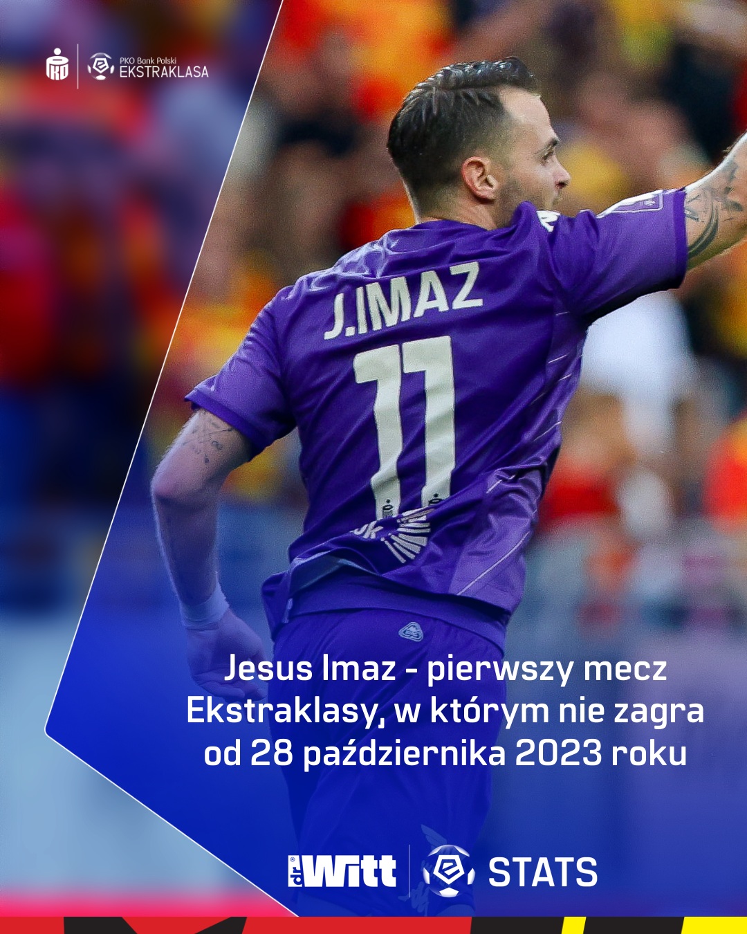 W 21. kolejce sezonu 2025/2026 Jesus Imaz pauzuje z powodu zawieszenia kartkowego. To pierwszy mecz Ekstraklasy, w którym Hiszpan nie zagra od 28 października 2023 roku (1:2 vs Pogoń Szczecin). 26 ostatnich meczów Jagiellonii bez Hiszpana zakończyło się: 6 zwycięstwami, 7 remisami i 13 porażkami (śr. 0,96 pkt/mecz).
