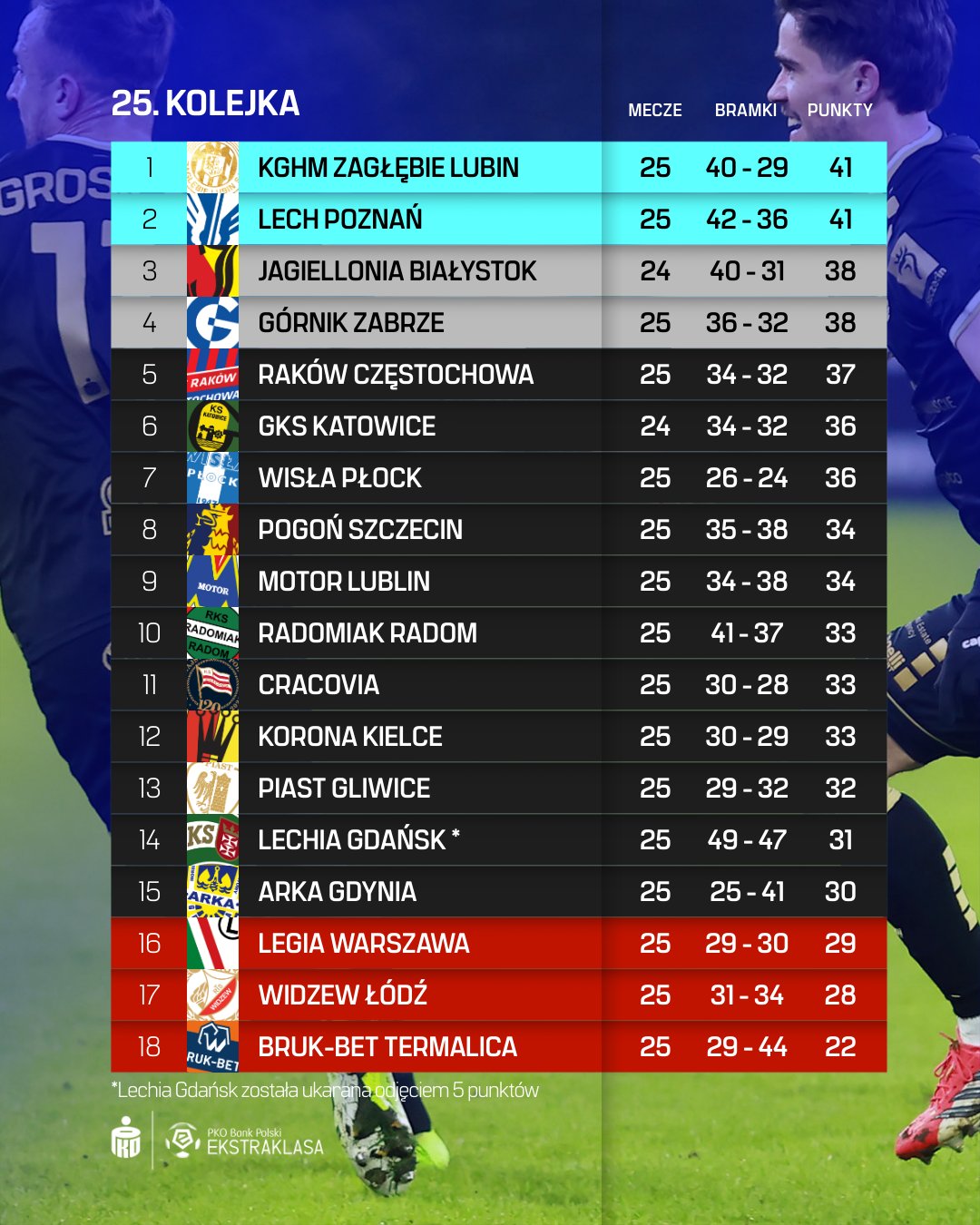 W tej kolejce doszło do rywalizacji 1. i 3. drużyny rozgrywek - KGHM Zagłębia Lubin i Lecha Poznań. Ostatecznie wygrali goście, dzięki czemu odrobili straty do Miedziowych. Wobec remisowego bilansu bezpośredniego (2:1 i 0:1), różnica bramek pozwoliła jednak jeszcze zachować pozycję numer jeden graczom Leszka Ojrzyńskiego. W ten sposób po raz czwarty w XXI wieku - a drugi po przerwie zimowej - obroniło miano lidera (też: 2006/2007 - 29. i 30. kolejka; 2016/2017 - 2. i 3. kolejka; 2018/2019 - 1. i 2. kolejka). Już we wtorek może do tego duetu pod względem dorobku dołączyć Jagiellonia Białystok. Czekają też dalsi pretendenci. Na przykład GKS Katowice w 2026 roku uzyskał 16 punktów w 7 starciach, dzięki czemu ewentualna pełna pula w zaległym starciu z Dumą Podlasia, dałaby mu najniższy stopień podium w klasyfikacji przejściowej. Obecnie różnica między 3., a 7. lokatą to tylko... dwa punkty!