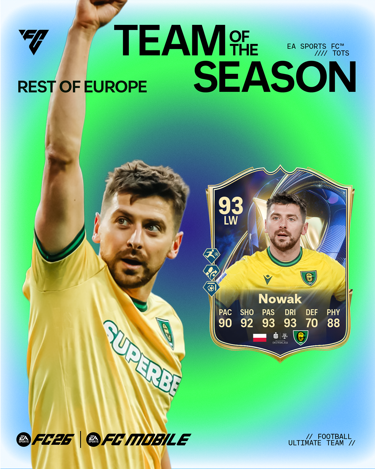 Bartosz Nowak nie zwalnia tempa – Ligowiec Roku 2025 w plebiscycie tygodnika „Piłka Nożna” oraz najlepszy asystent trwającego sezonu PKO BP Ekstraklasy dokłada kolejne wyróżnienie. Pomocnik GKS-u Katowice został wybrany do drużyny TOTS Rest of Europe w EA SPORTS FC 26, trafiając do grona zawodników, którzy w tym sezonie robili różnicę poza ligowym TOP5.